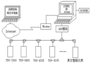 操作站到適配器之間采用高速串行或多串口通信。傳輸距離不大于20米。適配器到儀表之間采用RS485總線網(wǎng)絡(luò)型或RS232一一對(duì)應(yīng)輻射型。傳輸距離不大于1500米。