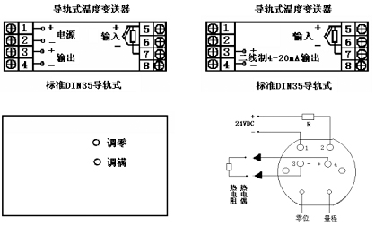 對導(dǎo)軌式溫度變送器輸入可以是熱電偶、熱電阻、標(biāo)準(zhǔn)信號。工作電源接端子1、2,4~20mA輸出信號接3正、4負(fù);對二線制4~20mA輸入信號正接5、負(fù)接6;熱電阻單端A5、并聯(lián)端B、C分別接67。
