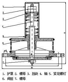用螺絲刀旋開序號5的兩個緊定螺釘,拆開序號1護(hù)罩,按開啟真空度要求,固定序號4軸,松開序號2螺母,調(diào)整好擋塊,調(diào)完畢并緊定序號2螺母,蓋上序號1護(hù)罩,鎖緊序號5的兩個緊定螺釘。彈簧作用力在真空為5-10KPa時即能打開,當(dāng)真空值超過20-30KPa時閥門全開,當(dāng)閥門下部有水,靠水的浮力自動關(guān)閉。